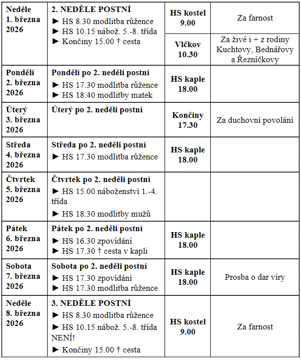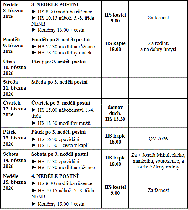 - V postní době se modlíme bolestná tajemství sv. růžence. Postní duchovní obnova: 20.-21.3. v HS.