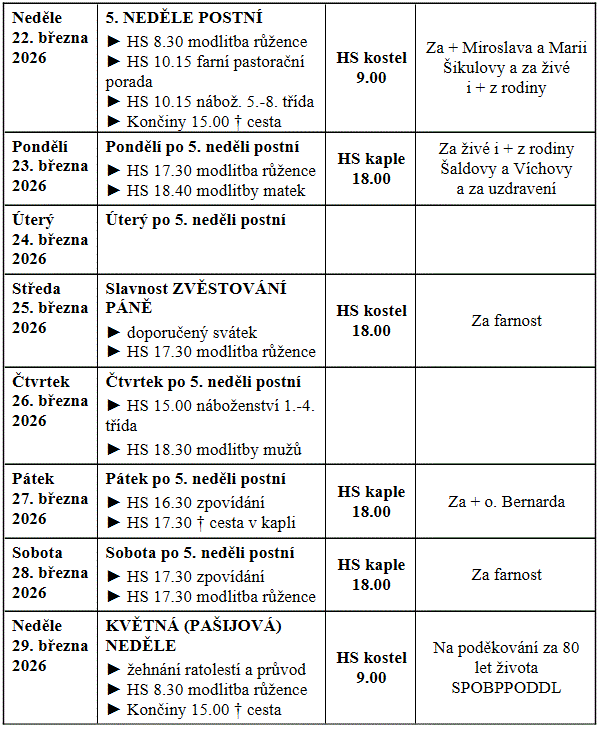 - Zbývající účelové sbírky ve farnosti v době postní: 22.3. sbírka na pojištění církevních budov, 3.4. sbírka na pomoc křesťanům ve Svaté zemi. Děkujeme všem dárcům.