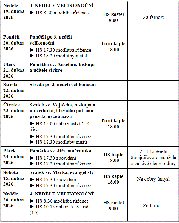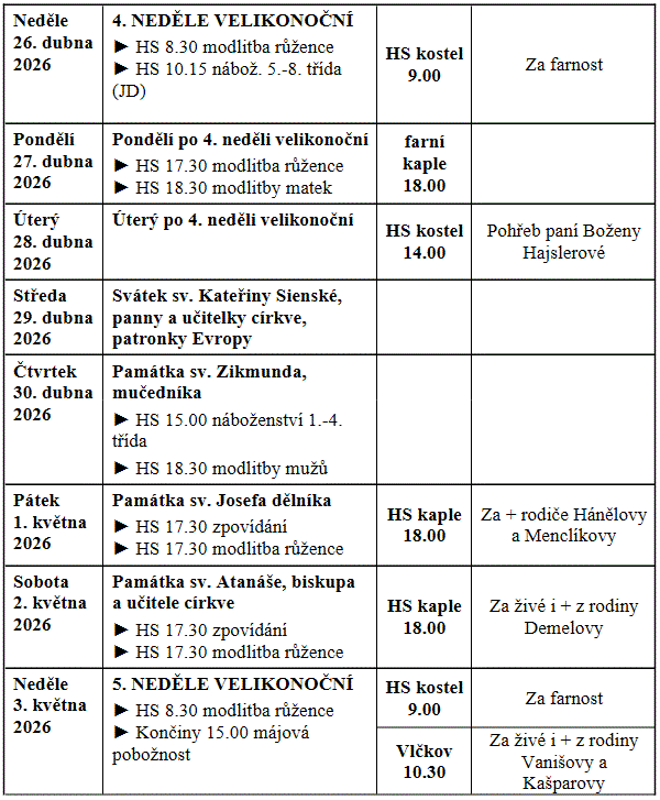 - V neděli 26.4. se bude konat sbírka na kněžský seminář. Díky všem dárcům.