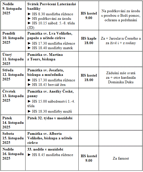 - Pohřeb + o. kardinála Dominika Duky se koná v sobotu 15.11. od 11 hodin v katedrále sv. Víta, Václava a Vojtěcha v Praze. Ve farnosti budeme sloužit zádušní mši svatou ve středu 12.11., kdy si připomeneme rok a půl od jeho návštěvy ve farnosti při příležitosti udílení svátosti biřmování.
